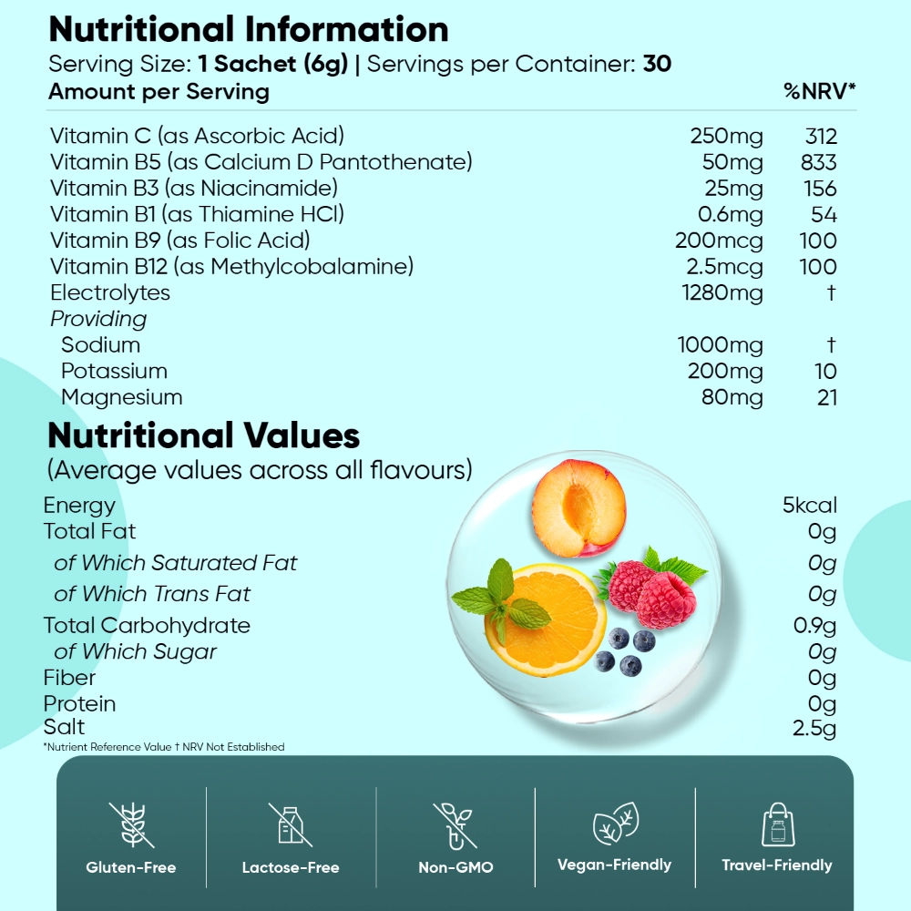 - Blend of 9 natural electrolytes, vitamins & minerals